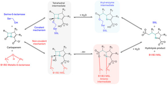 Schematic representation of hydrolytic mechanism of carbapenems by serine β-lactamases and B1/B3 metallo-β-lactamases. The β-lactam ring opening by B2 metallo-β-lactamases is not depicted here. This mechanism shares similarities with B1/B3 subfamilies, except for the presence of a single zinc Zn2⁺ ion in their active site.