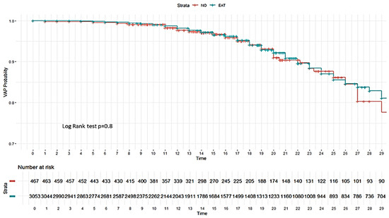 No impact of EAT was observed on the development of VAP (Figure 2) or on 28-day mortality in the ICU (Figure 3).