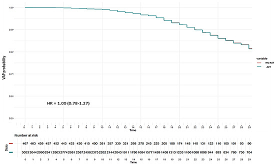There was also no effect of EAT on the proportional hazard of VAP (HR = 1.00, 95%CI 0.78–1.27) when Cox regression was performed adjusting the model for age, chest X-ray cutoff, steroids, diabetes, obesity and lactate with a Shoenfeld global test of 0.35 (Figure 4 and Table S7 in the Supplementary Materials).