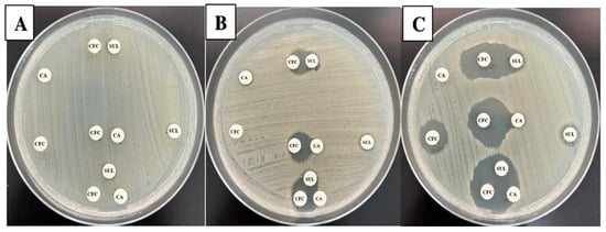 Disk approximation method. The figure displays the results for three selected isolates. In each plate (labeled A–C), disks holding CFC, CA, and SUL were applied separately or adjacent to each other with the possibilities of CFC:CA, CFC:SUL, and CFC:CA:SUL. Panel (A) represents an isolate that showed resistance to all individual agents and lack of synergy between all combined possibilities. On the other hand, panels (B,C) revealed partial and full synergy between all adjacent agent possibilities.