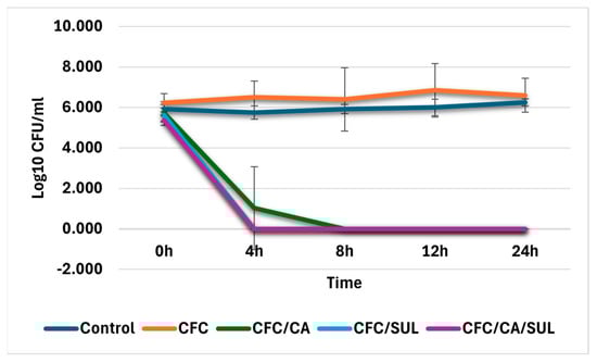 Time–kill assay results. The Log10 CFU/mL was plotted against different times of incubations. Four representative isolates were analyzed, and the blue line indicates bacterial growth control. Error bars represent the mean of log 10 CFC/mL of two independent experimental repeats. Abbreviations: CFC—cefaclor, CA—clavulanic acid, SUL—Sulbactam.