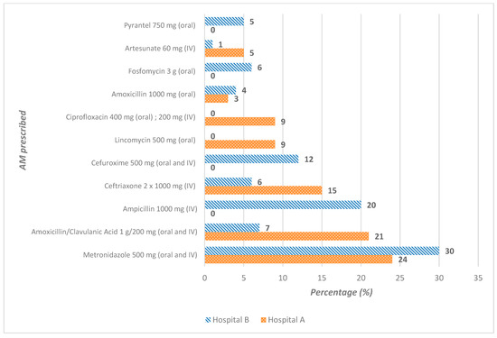 Of the AM prescribed in the two hospitals, metronidazole accounted for 27% of prescriptions: 22 out of 92 (24%) in hospital A and 36 out of 120 (30%) in hospital B. Hospital A prescribed more amoxicillin/clavulanic acid (19/92; 21%) and ceftriaxone (14/92; 15%) than hospital B, which prescribed more ampicillin (24/120; 20%) and cefuroxime (14/120; 12%) (Figure 2). However, direct comparisons should be interpreted with caution, as hospital B specializes in gynecology and obstetrics, whereas hospital A is a general hospital with a small emergency department.
