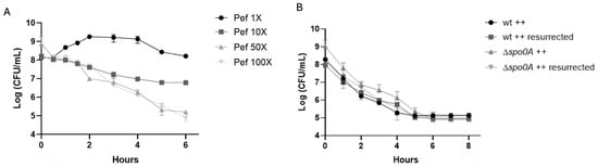 Our experimental approach relied on a robust model where exponential-phase cultures of C. difficile were challenged with pefloxacin at concentrations ranging from 1× to 100× MIC. Notably, a biphasic killing curve, typical of persister formation [13], was evident at 50× MIC (Figure 1). For 100× MIC, at longer times, we did not clearly appreciate biphasic behavior. Considering this, we decide to use 50× MIC for all experiments. We subsequently enriched persister populations through selective lysis treatments, confirming through revival experiments that these cells were indeed persisters and not antibiotic-resistant mutants, consistent with previous reports [31,34]. The use of a Δspo0A mutant strain confirmed that the observed phenotypes arose solely from vegetative cells, eliminating potential confusion from spore formation.