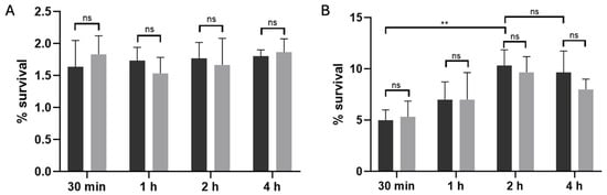 To distinguish between stochastic and antibiotic-triggered persisters, we subjected exponential-phase cultures of C. difficile R20291 to a 15 min lysis treatment either without antibiotic exposure (Figure 2A) or after a 50× MIC pefloxacin challenge (Figure 2B), as previously described [31,34]. In the absence of the antibiotic, lysis of untreated cultures resulted in a low and time-independent survival rate of approximately 1.8%, reflecting the basal frequency of stochastic (type I) persister cells. By contrast, when cultures were pre-exposed to pefloxacin for 30 min, 1, 2, and 4 h before lysis, survival rose markedly, peaking at ~10% after 2 h and remaining stable through 4 h. This difference between antibiotic-treated and untreated lysed samples was highly significant (p < 0.005). Notably, the persistence profiles of the wild-type and Δspo0A mutant strains (black and gray bars, respectively) were indistinguishable at all time points (ns), thereby excluding a role for Spo0A-mediated sporulation in persister enrichment. Together, these data confirm that high-dose pefloxacin specifically induces a non-sporulating persister subpopulation in C. difficile R20291, which can be selectively enriched through lysis treatment.