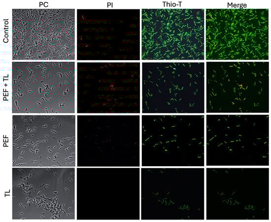 In untreated control cultures, the vast majority of cells exhibited intense Thio-T fluorescence and negligible PI uptake (Figure 3, control, row 1), confirming robust RNA synthesis and intact cell envelopes. When cultures were treated with pefloxacin alone (PEF; Figure 3, PEF, row 3), Thio-T labeling decreased markedly, and a small fraction of cells became PI-positive, indicating that antibiotic stress impairs RNA metabolism and induces limited membrane damage. Lysis buffer treatment without prior antibiotic exposure (Figure 3, TL, row 4) resulted in near-absence of Thio-T signal and no detectable PI fluorescence, consistent with extensive membrane disruption and depletion of intact RNA.