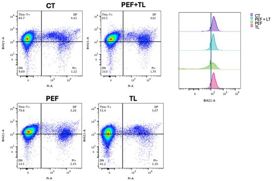 By contrast, pefloxacin alone (PEF) modestly reduced Thio-T+ cells to 79.8% and increased PI+ to 2.5%, and lysis alone (TL) decreased Thio-T+ to 53.4% (compared with CT) while elevating DN to 42.2% (compared with CT) (Figure 4 left; Figure S2). The considerable DN rise under TL reflects extensive metabolic shutdown rather than selective antibiotic tolerance, and the left-shifted Thio-T histogram confirms loss of activity (Figure 4 right). Taken together, only PEF + LT preserves a high-activity, intact-membrane phenotype matching untreated cells; this balance (high Thio-T+/low PI+ with control-level DP and DN) suggests the most significant enrichment of true persister cells.