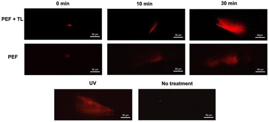 Chaperone-associated ATPases followed a similar pattern: at 10 min, clpC increased ~3.8-fold in PEF + TL versus ~2.1-fold in PEF and ~2.4-fold in TL, while clpX peaked at ~4.2-fold under PEF + TL but showed only ~2.0-fold induction in PEF and no significant change in TL. By 30 min, clpC expression had tapered toward CT levels in all treatments, whereas clpX further escalated to ~5.5-fold in PEF + TL and ~3.0-fold in PEF, remaining low in TL. clpB expression did not differ significantly from CT under any condition or time (Figure 6B,E).