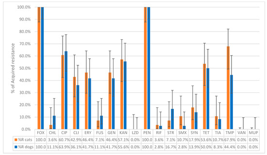 The percentage of acquired resistance in non-wild type isolates of MRSP collected from 102 dogs to the tested antibiotics. FOX: Cefoxitin; CHL: Chloramphenicol; CIP: Ciprofloxacin; CLI: Clindamycin; ERY: Erythromycin; FUS: Fusidic acid; GEN: Gentamicin; KAN: Kanamycin; LZD: Linezolid; PEN: Penicillin; RIF: Rifampicin; STR: Streptomycin; SMX: Sulfamethoxazole; SYN: Quinupristin–Dalfopristin; TET: Tetracycline; TIA: Tiamulin; TMP: Trimethoprim; VAN: Vancomycin; MUP: Mupirocin. Sensititre® EUST2 panel.