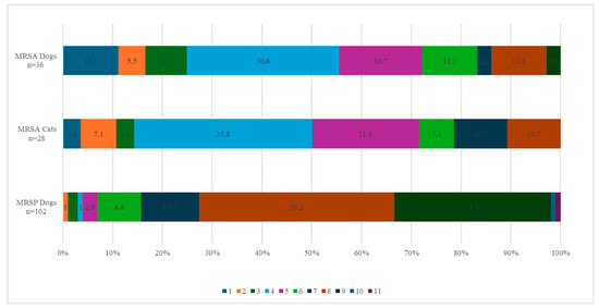 Percentage of MRSA and MRSP strains from dogs and cats resistant to the corresponding number of antibiotic families. The colour legend indicates the number of families of antibiotics to which the strains are resistant. The abscissa indicates the percentage of strains resistant to the corresponding number of antibiotic families.