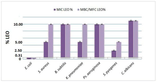 Mean MIC and MBC/MFC values (% v/v) of LEO against tested microorganisms (n = 3). Error bars represent standard deviation.