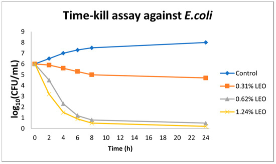In the time–kill assays conducted against E. coli ATCC 25922, essential oil from L. angustifolia exhibited a clear concentration- and time-dependent bactericidal effect. At the lowest concentration tested (0.31% v/v), a modest reduction of approximately 1.5 log10 CFU/mL in viable cell count was observed over a 24 h period. Increasing the LEO concentration to 0.62% v/v resulted in a reduction of ≥3 log10 CFU/mL by the 8th h, thereby surpassing the threshold for bactericidal activity. At the highest tested concentration (1.24% v/v), bacterial counts fell below the detection limit (<1 log10 CFU/mL) within 6 h, indicating the near-complete eradication of the bacterial population. In contrast, the control sample containing only the solvent exhibited no appreciable decline in viable cell count over the same time period (Figure 2).