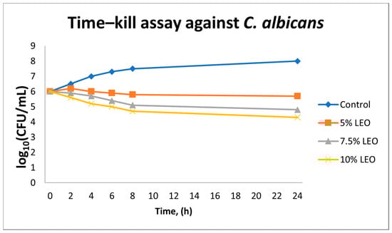 In the case of C. albicans ATCC 10231, LEO showed markedly lower antifungal efficacy. Even at the highest concentration evaluated (10% v/v), the reduction in fungal colony-forming units did not exceed 2 log10 CFU/mL at 24 h. At concentrations of 5% and 7.5% v/v, only a minimal inhibition of growth was observed, falling short of the ≥3 log10 threshold generally associated with fungicidal activity. Control samples maintained a stable population throughout the experiment, confirming that the limited reductions observed were attributable to the biological activity of the essential oil, rather than any solvent-related effects (Figure 3).