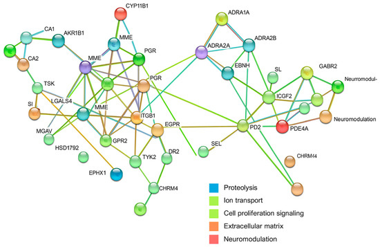 We constructed a protein–protein interaction (PPI) network using STRING v11.5 to explore the molecular mechanisms underlying the biological activity of linalool, linalyl acetate, and ampicillin. This analysis provided an overview of predicted interactions among the identified human protein targets and revealed several functionally distinct clusters. These included proteins associated with proteolysis and extracellular matrix remodeling, ion transport and pH regulation, cell signaling and proliferation, and neuromodulation. Central nodes such as EGFR and DRD2 were identified as potential key regulators within the network. These findings suggest that components of lavender essential oil (LEO) may influence not only antimicrobial activity but also broader physilogical functions, particularly those related to neural regulation (Figure 4).