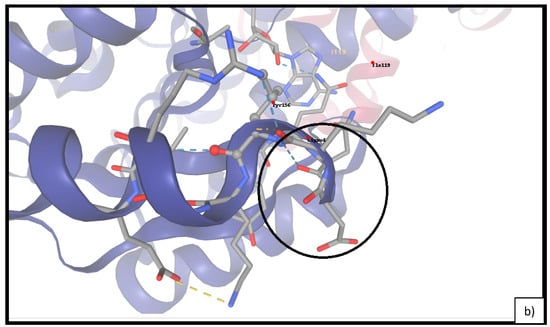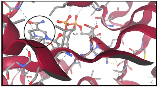 Molecular docking of FabI (PDB ID: 4CV3) with linalool (a) and linalyl acetate (b). The black circles indicate the binding site regions and key molecular interactions in each protein–ligand complex.