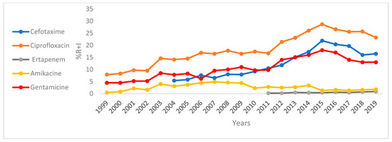 Figure 1 and Figure 2 and Supplementary Tables S1 and S2 depict the trends of resistance plus intermediate resistance of E. coli and K. pneumoniae to a selected number of antibiotics over the period 1999 to 2019. E. coli isolates were highly susceptible to IMP, AMK, and FOX throughout the study period (Table S1). However, susceptibility towards ciprofloxacin, cefotaxime, and gentamicin has been decreasing over the last few years (Figure 1). A statistically significant (p < 0.05) correlation was observed between E. coli and its resistance to CTX (r = 0.91, from 5.4% in 2004 to 16.5% in 2019), CIP (r = 0.93, from 7.9% in 1999 to 23.2% in 2019), and ERT (r = 0.89, from 0.2% in 2012 to 0.9% in 2019) during this period.