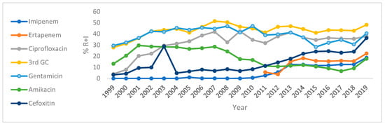 Figure 2 and Table S2 depict the trends of resistance plus intermediate resistance of K. pneumoniae to a selected number of antibiotics, namely CTX, IMP, ERT, CIP, GEN, and AMK, over the period from 1999 to 2019. Resistance of K. pneumoniae showed a very strong positive correlation (p < 0.005) to IMP (r = 0.92, from 1% in 2005 to 18.6% in 2019) and ERT (r = 0.78, from 5.6% in 2011 to 22.4% in 2019); and a strong positive correlation to FOX (r = 0.72, from 27.9% in 1999 to 48.2% in 2019) and CIP (r = 0.63, from 4% in 1999 to 37.9% in 2019). However, the resistance of K. pneumoniae to AMK showed a strong negative correlation, which was statistically significant (r = −0.74, p < 0.05).