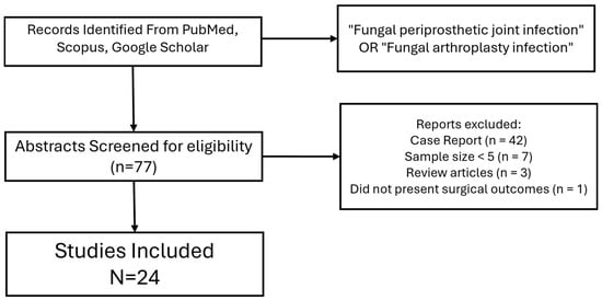 We searched PubMed, Google Scholar, Orth Evidence, book chapters and infection societies consensus and SCOPUS for the following search terms “Fungal periprosthetic joint infection”, “Prosthetic joint infection”, “Fungal infection” and “arthroplasty infection”. We also looked at basic science and medical treatment of fungal infections. For studies involving the surgical management of fungal periprosthetic joint infection (fPJI), we included review articles and only studies written in English. Case reports, technique papers, biomechanical, basic science, and studies with less than 5 patients were excluded. Abstracts were screened for relevance by two reviewers (H.A. and Y.K.). Full papers deemed to fall within the inclusion criteria were then screened to assess eligibility, as shown in Figure 1. Full paper texts deemed to meet the inclusion criteria were discussed between the two reviewers before being included in the analysis. Disputes on study eligibility were discussed between the remaining authors until a unanimous decision was made. Treatment success was defined as no signs of infection at the final timepoint without need for return to OR outside of the intended initial treatment plan.