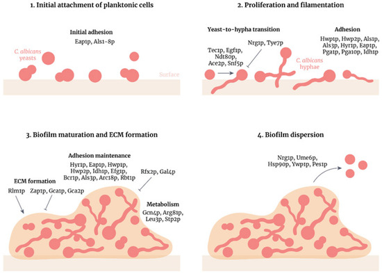 Stages of Candida albicans biofilm formation and development. Candida albicans biofilm formation is a multifactorial process that consists of the following four main stages. (1) Initial attachment of planktonic cells: C. albicans yeasts attach to a surface (e.g., epithelia, biomaterials or cellular aggregates) through adhesins. (2) Proliferation and filamentation: yeasts transition to hyphae and this process is regulated by many transcription factors. (3) Biofilm maturation and extracellular matrix formation: the matrix forms around the C. albicans cells, positively regulated by the TF Rlm1p, providing structural support and protection against antifungals and the host immune system. Adhesion is maintained and amino acid metabolism is increased in the biofilm. (4) Biofilm dispersion: yeast cells disperse from the biofilm to form colonies in other parts of the body. These cells differ from initial planktonic cells as they are more virulent and more likely to form biofilms. Reprinted from open access reference [38].