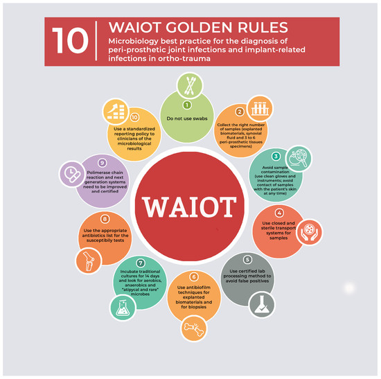 Microbiology best practice for the diagnosis of peri-prosthetic joint infections and implant-related infections in ortho-trauma patients, including the 10 WAIOT golden rules. Reprinted with permission from publisher. Open access reference [42].