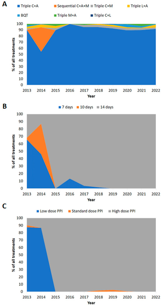 Prescription patterns in Ireland over time (2013–2022). (A) Treatment regimen prescribed. (B) Treatment duration. (C) Dose of PPI prescribed. C: clarithromycin; A: amoxicillin; M: metronidazole; L: levofloxacin; BQT: bismuth quadruple therapy; low-dose PPI: 20 mg omeprazole equivalent twice daily; standard-dose PPI: 40 mg omeprazole equivalent twice daily; high-dose PPI: 80 mg omeprazole equivalent twice daily.