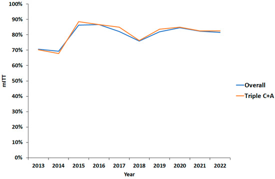 Finally, multivariate regression analysis was performed to examine the impact of multiple variables on mITT cure rates from 2013 to 2022. Good compliance and the use of high-dose PPI were significantly associated with better overall mITT rates (OR 4.5, 95% CI 1.4–14.2 and OR 1.9, 95% CI 1.2–2.8, respectively) (Table 6). Good compliance and increased acid suppression were also significantly associated with the success of triple C + A therapy (OR 4.2, 95% CI 1.2–14.2 and OR 1.9, 95% CI 1.1–3.2, respectively) (Table 6). Age, sex, indication, and treatment duration were not significantly associated with an increase in treatment effectiveness by multivariate analysis.