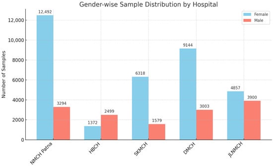 Figure 2 presents the gender-wise distribution of samples received across the five facilities. In most hospitals, more samples were received from female patients. NMCH Patna recorded the highest number of female samples (n = 12,492) compared to males (n = 3294), followed by DMCH (n = 9144 females vs. n = 3003 males) and SKMCH (n = 6318 females vs. n = 1579 males). In contrast, HBCH reported more male samples (n = 2499) than female samples (n = 1372).