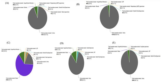 Number of samples received from different hospitals. (A) SKMCH, (B) NMCH, (C) HBCH, (D) DMCH, (E) JLNMCH.