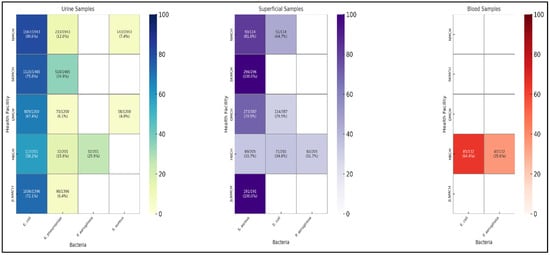 The distribution of bacterial species isolated from urine and superficial infection and blood samples among the different facilities is shown in Figure 6. The most prevalent bacterial species isolated from urine samples was E. coli, whereas the most prevalent bacterial species found in samples of superficial infections was S. aureus.