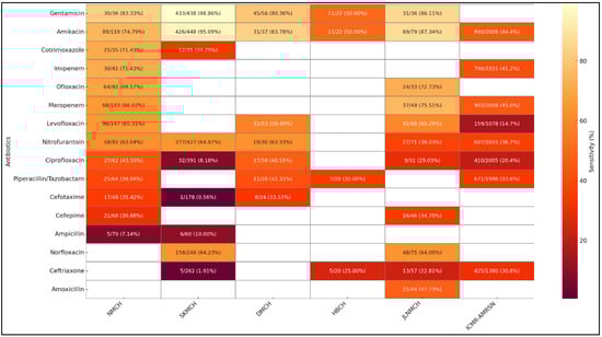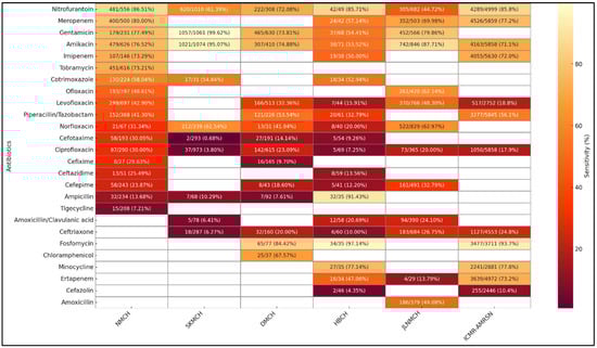 AST was performed with the disc diffusion method for the following antimicrobials: doxycycline, azithromycin, ampicillin, ciprofloxacin, amikacin, imipenem, levofloxacin, gentamicin, cefepime, piperacillin–tazobactam, ertapenem, meropenem, cotrimoxazole, cefoxitin, ceftriaxone, etc., according to Clinical & Laboratory Standards Institute (CLSI) guidelines [37,38]. The antibiotic discs were selected based on CLSI guidelines and the specific organism being tested to ensure appropriate pathogen–drug matching. The national data from the ICMR Antimicrobial Resistance Surveillance Network (AMRSN) were used as a benchmark to compare susceptibility patterns observed in five tertiary care hospitals in Bihar [23].