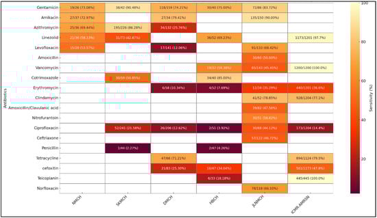 In Klebsiella spp., gentamicin and amikacin show the highest efficacy, particularly at SKMCH (98.86% and 95.09%) and JLNMCH (86.11% and 87.34%). Sensitivity to commonly used antibiotics like ciprofloxacin, cefotaxime, and ampicillin remains critically low across all sites (Figure 9).