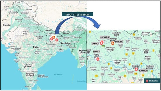 - National Health Systems Resource Centre (NHSRC). Bihar Health Dossier 2021. Available online: https://nhsrcindia.org/sites/default/files/practice_image/HealthDossier2021/Bihar.pdf (accessed on 30 May 2025).