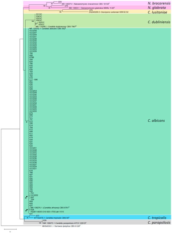 DNA extraction was conducted utilizing a lysis buffer and 0.5 mm diameter beads on the Candida spp. strains, which were incubated at a temperature of 37 °C on Sabouraud Dextrose Agar (SDA). The amplification of the internal transcribed spacer (ITS) region was executed using the primers ITS5 (forward primer: 5′-GGAAGTAAAAGTCGTAACAAGG-3′) and ITS4 (reverse primer: 5′-TCCTCCGCTTATTGATATGC-3′). The amplification products were subsequently purified with the PureLink™ Quick Gel Extraction Kit (Thermo Fisher Scientific, Waltham, MA, USA), in accordance with the manufacturer’s guidelines. Sequencing of the strains was performed at Macrogen Chile (Las Condes Santiago, Chile) using an ABI 3130 sequencer. Consensus sequences were generated employing the SeqMan software 7.0 (DNASTAR, Inc., Madison, WI, USA). The resulting DNA sequences were evaluated through the BLASTn search tool, referencing data from the GenBank database of the National Center for Biotechnology Information (NCBI). Multiple sequence alignment was accomplished using the MUSCLE program. For phylogenetic inferences, maximum-likelihood (ML) analysis was conducted using PhyML (version 3.0), applying heuristic search methods with starting trees derived from random addition with 100 replicates and nearest-neighbor interchange (NNI) branch swapping. For bootstrap ML analysis, we performed 1000 replicates (NJ starting tree with NNI branch swapping).