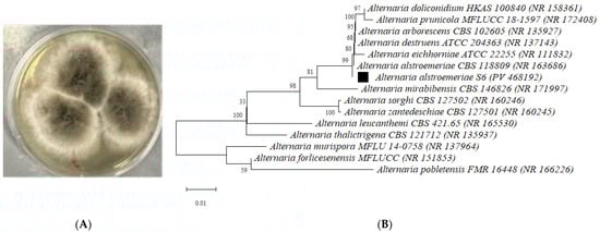 Identification of A. alstromeriae S6. (A) Colony morphology on potato dextrose agar (PDA) after 7 days of incubation at 25 °C. Petri dish diameter: 100 mm. (B) Neighbor-joining phylogenetic tree based on ITS region sequences, constructed using MEGA 12. Reference sequences were retrieved from GenBank (NCBI BLAST). The bootstrap consensus tree was inferred from 1000 replicates. All positions containing gaps and missing data were eliminated from the dataset (complete deletion option). Scale bar: 0.01 substitutions per nucleotide site.