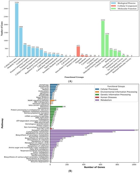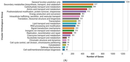 Functional annotation via EggNOG-mapper assigned putative function to 9303 (67%) of the predicted proteins, including GO (gene ontology) terms, and COG (collections of clusters of orthologous genes) categories. The GO analysis identified 29 functional groups categorized into three major classes: (i) biological processes, dominated by cellular processes with 3328 genes; (ii) cellular components, where protein complexes represented the largest group with 632 genes; and (iii) molecular functions, in which molecular regulators were the most abundant category, comprising 2234 genes (Figure 2A). In addition, the COG analysis classified 6549 genes (excluding 2337 function-unknown genes) into 21 functional categories, with the largest group being “general function prediction only”, which included 1239 genes, accounting for 14% of the annotated genes. Notably, 617 genes (7%) were associated with “secondary metabolite biosynthesis, transport, and catabolism” (Figure 2B).