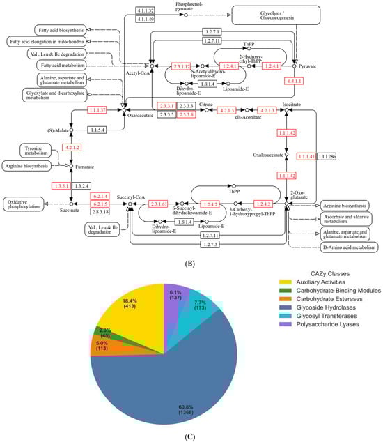In parallel, KEGG pathway analysis mapped 4849 genes (34.9% of the proteome) to 143 metabolic pathways, distributed across 5 functional groups, i.e., cellular processes, environmental information processing, genetic information processing, human diseases, and metabolism. The most enriched pathways included carbohydrate metabolism (745 genes), amino acid metabolism (468 genes), and biosynthesis of secondary metabolites (404 genes) (Figure 3A), reflecting metabolic versatility and potential for specialized compound production of A. alstroemeriae. Moreover, 16 tricarboxylic acid cycle (TCA) genes (KEGG map00020) (Figure 3B) and 5 glyoxylate pathway genes (map00630) (Supplementary Figure S1) essential for succinic acid biosynthesis were identified through KEGG annotation. CAZyme (carbohydrate-active enzyme) annotation using the dbCAN database identified 3096 CAZyme domains and 455 unique genes encoding enzymes critical for carbohydrate metabolism. These were classified into six major CAZy categories: glycoside hydrolases (GHs; 1366 domains), glycosyltransferases (GTs; 173 domains), polysaccharide lyases (PLs; 137 domains), carbohydrate esterases (CEs; 113 domains), carbohydrate-binding modules (CBMs; 45 domains), and auxiliary activities (AAs; 413 domains) (Figure 3C).