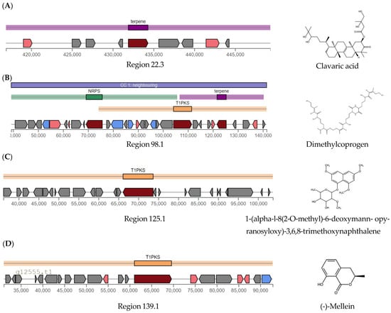 Biosynthetic gene clusters of A. alstroemeriae S6 identified by AntiSMASH 8.0. A–D: High-similarity clusters (green confidence level against MIBiG references). (A) Clavaric acid (region 22.3, node_22: 416,906–449,316 nt; 32.4 kb); (B) dimethylcoprogen (region 98.1, node_98: 39,203–141,477 nt; 102.3 kb); (C) 1-(α-l-8(2-O-methyl)-6-deoxymannopyranosyloxy)-3,6,8-trimethoxynaphthalene (region 125.1, node_125: 36,155–103,705 nt; 67.6 kb); (D) (-)-mellein (region 139.1, node_139: 31,086–92,835 nt; 61.75 kb). E–G: Medium-similarity clusters (orange confidence level against MIBiG references). (E) Higginsianin B (region 33.2, node_33: 147,788–216,554 nt; 68.8 kb); (F) heptelidic acid (region 49.1, node_49: 17,663–49,107 nt; 31.4 kb); (G) (+)-asperlin (region 99.1, node_99: 83,572–148,692 nt; 65.1 kb). Visualizations are generated from AntiSMASH outputs. Gene colors: core biosynthetic genes (burgundy), additional biosynthetic genes (purple), transport-related genes (blue), regulatory genes (green), and other genes (gray). Five low-similarity BGCs were excluded.