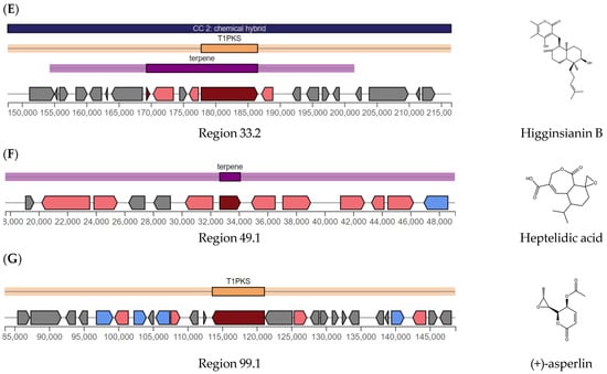 The 31.4 kb terpenoid cluster (region 49.1, node_49: 17,663–49,107 nt), containing 13 genes, shows homology to the heptelidic acid pathway of Aspergillus oryzae (BGC0001995.3) (Figure 4F), which features a core terpene cyclase (g7511.t1) flanked by six cytochrome P450s (g7506.t1, g7507.t1, g7510.t1, g7512.t1, g7514.t1, g7516.t1) responsible for oxidative tailoring. The key modifications are mediated by an aldehyde dehydrogenase (g7513.t1) and short-chain dehydrogenases/reductases (SDRs; g7515.t1), while a sugar transporter (g7517.t1) suggests the export of products.