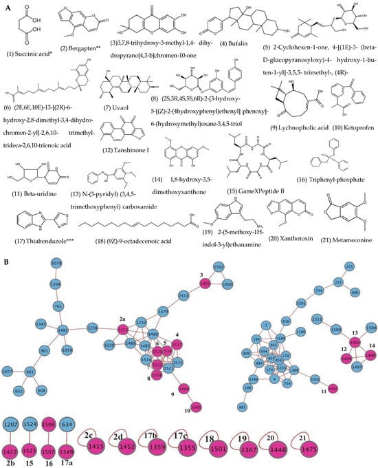 Molecular network of A. alstroemeriae S6 secondary metabolites. (A) Structures of 21 identified compounds. (*) Succinic acid (1) was isolated and structurally confirmed by X-ray crystallography; (**) bergapten (2) appeared in 4 nodes (2a–2d); (***) thiabendazole (17) occurred in 3 nodes (17a–17c). (B) Network displays 15 compounds (highlighted in red) containing nodes out of 77 total nodes. Numbers within nodes indicate cluster assignments and edges represent spectral similarity (cosine score ≥ 0.6). Molecular network analysis was performed using GNPS with MS/MS spectral data, and the network was visualized using Cytoscape 3.10.3.