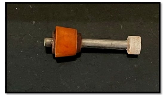 In order to create cylindrical specimens that were 40 mm in length and 8 mm in diameter, CpTi rods were procured from Mishra Dhatu Nigam Limited, Hyderabad, India. Using cold-cure epoxy resin (Amkay′s Epoxy Resin by Amkay Chem, Rajasthan, India), each rod was mounted to reveal a single flat surface that measured roughly 0.95 cm2 (Figure 1). This surface was intended for microbiological exposure and antimicrobial coating.