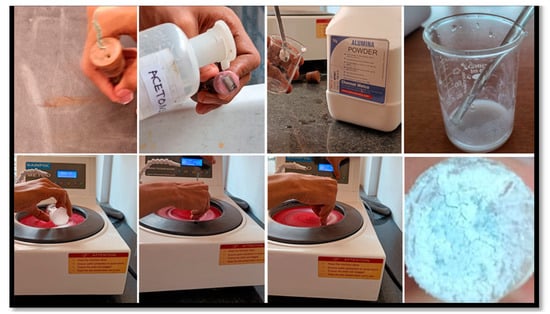 Standard metallographic processes were used to polish the exposed titanium surfaces. To eliminate surface imperfections, belt grinders (80 micron) and progressively finer grades of emery paper were used for 20 min for the initial polishing. A mirror-like finish was then achieved by a final polishing with levigated alumina on a polishing wheel. In order to prepare the specimens for coating, they were polished, then ultrasonically cleaned in acetone to eliminate any organic impurities, rinsed well with double-distilled water, and dried in a hot air oven at 37 °C (Figure 2) [].