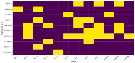 Figure 1 reveals (i) sustained colonization of specific wet niches, e.g., SINK-ICU-02 and SINK-ICU-05, where the clone was recovered in ≥6 contiguous weeks; (ii) episodic spill-over onto operating-room floors during weeks 7–10, suggesting periodic environmental dissemination likely driven by workflow or cleaning lapses; and (iii) successful clearance of several sites (e.g., SINK-ICU-01) after week 6, consistent with targeted remediation. This temporal, site-resolved view highlights hidden reservoirs and helps infection-control teams time and target intensified decontamination or engineering fixes (e.g., drain replacement) before sporadic positives evolve into ward-wide outbreaks (see Supplementary Materials).