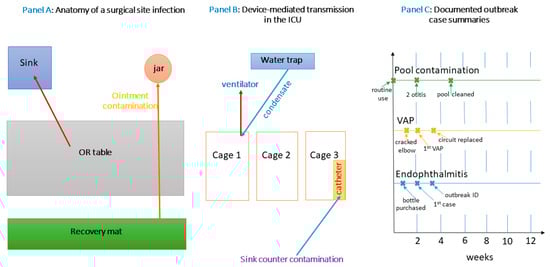In Figure 2, by combining a surgical-site schematic (Panel A), an ICU device-transmission diagram (Panel B), and concrete outbreak timelines (Panel C), this figure provides a comprehensive visual narrative of how P. aeruginosa moves from environmental niches into veterinary patients. Panel A focuses on contamination pathways in the OR, Panel B on high-risk device interactions in the ICU, and Panel C on documented outbreaks that reinforce the critical role of environmental reservoirs. Viewed together, these panels illustrate the multifactorial nature of nosocomial transmission and underscore the need for vigilant environmental monitoring, strict device protocols, and rapid engineering or procedural interventions to prevent and control infections in veterinary settings (see Supplementary Materials).