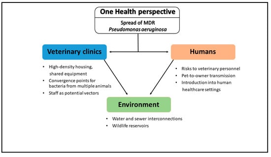 Although veterinary and human medical infrastructures often operate independently, they are linked through shared bacterial pools, overlapping staff networks, and sometimes shared supply chains for disinfectants or pharmaceuticals. Clinic technicians who work part-time in human hospitals or veterinary staff who inadvertently bring contaminated scrubs home may introduce MDR P. aeruginosa into the human healthcare setting. Conversely, human hospital workers who treat pets or volunteer at animal shelters can import resistant strains back into veterinary wards [41,57,93].