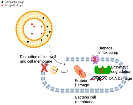 Bacteria can develop resistance mechanisms against drugs through various pathways, such as enzymatic inactivation of the drug and active efflux pumping, which expels the drug from the cell [43]. Numerous studies have demonstrated that liposome-based antibiotic formulations can be effective in treating antibiotic-resistant bacteria (Figure 1) [44].