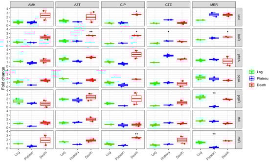 | Genes | Antibiotics | Fold Change | Log | Plateau | Death | p |
