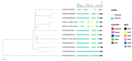 To analyze the global distribution of the bacterium, the sequence was examined using the Pathogen.watch server (https://pathogen.watch/, accessed on 28 April 2024).