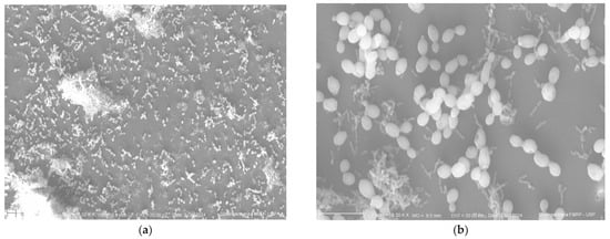 The microorganisms selected for in vitro biofilm formation in this study (S. mutans, C. albicans, and L. casei) are closely associated with dental caries and are commonly found in the oral cavity [,,,,,,,,,]. S. mutans is considered the main etiological agent of caries, while C. albicans is the most prevalent fungus in the oral cavity and interacts synergistically with S. mutans, enhancing the cariogenicity of the dental biofilm [,,]. Additionally, Streptococcus and Lactobacillus act as primary colonizers, promoting the adhesion of other microorganisms to the acquired pellicle, and L. casei exhibits greater adhesion capacity when associated with S. mutans [,].