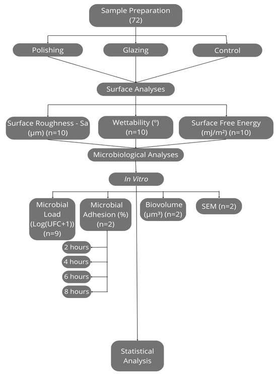 The sample size for surface analyses was determined based on the data from Cepic et al. (2020) [] using OpenEpi-Toolkit Shell for Developing New Applications (available online: https://www.openepi.com/SampleSize/SSMean.htm, accessed on 29 May 2025) with n = 10 being recommended. For microbiological analyses, n = 9 was used [,,,], performed in biological triplicate, as recommended in the literature for colony-forming unit calculations. Additionally, n = 2 was used for scanning electron microscopy (SEM), biovolume [] and the microbial adherence of viable and dead microorganisms after 2, 4, 6 and 8 h []. The experimental protocol is summarized in Figure 7.