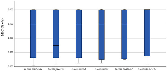 MIC (% v/v) box-plots for six E. coli strains; Kruskal–Wallis p = 0.998.