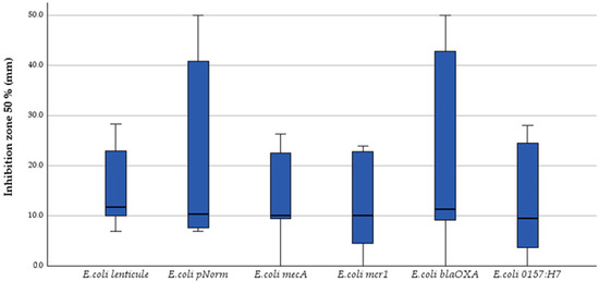 Kruskal–Wallis one-way ANOVA on ranks revealed no significant strain-to-strain variation for any end-point: MIC (H = 0.30, p = 0.998) (Figure 1), MBC (H = 0.84, p = 0.975) (Figure 2) and inhibition-zone diameters at 50% (Figure 3), 25%, 12.5%, 6.25%, 3.125% and 1.56% v/v dilutions (H = 1.55, 1.15, 3.38, 3.85, 2.55 and 2.28; p = 0.907–0.571). Dunn post hoc contrasts with Bonferroni correction were uniformly non-significant (padj = 1.000), confirming the absence of strain-specific effects.